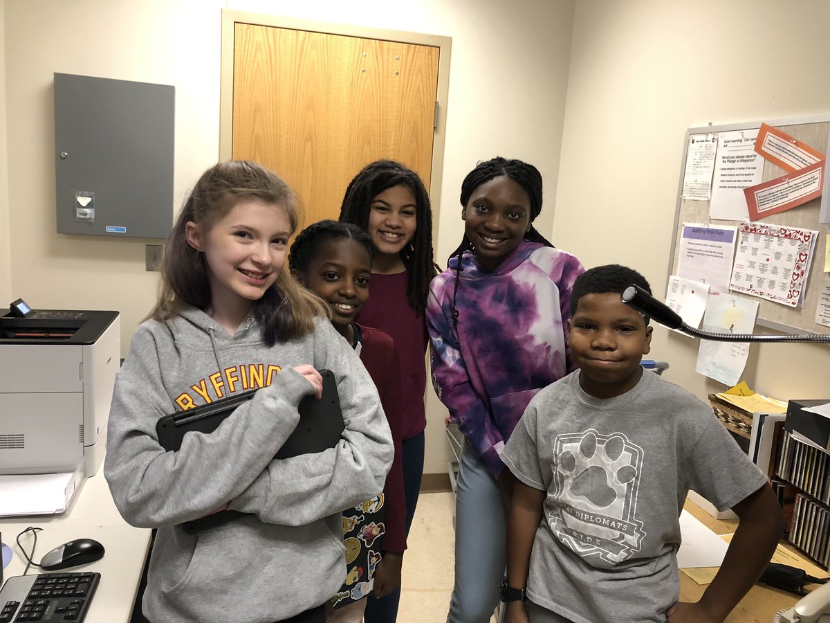 Students sharing about Barack Obama and Aretha Franklin on the morning announcements.