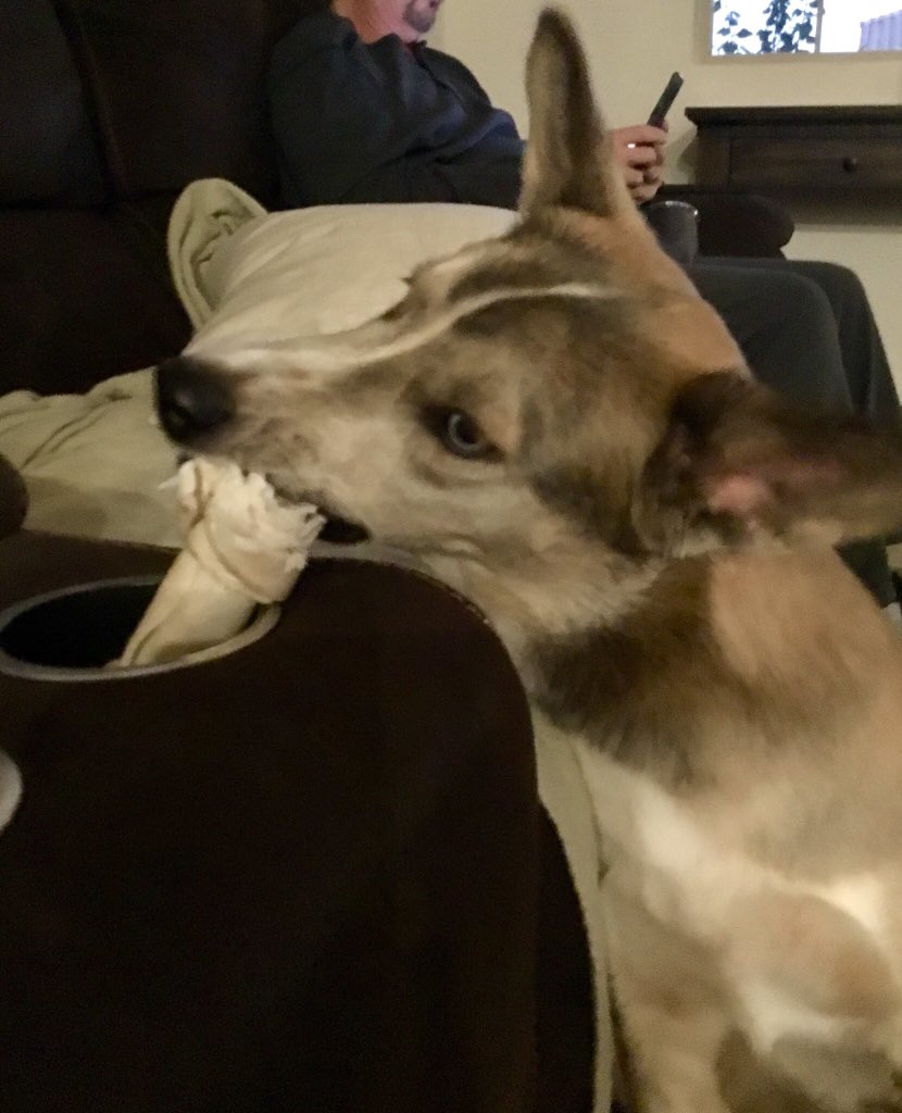 Kaos took a second away from chewing to get some water & Bleu didn’t waste time on snatching her bone...this goes on all day with these two. My two