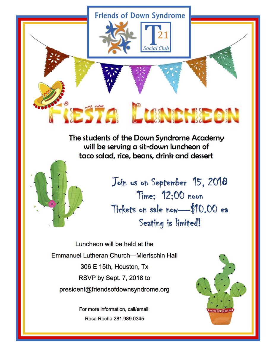#Fiesta Luncheon at Immanuel Lutheran Church in the#Heights! Do you have your ticket? No tickets will be sold at the door. All proceeds benefit adults with#Downsyndrome in#Houston! RSVP by Wednesday!pic.twitter.com/Y7IHJ0ktP6