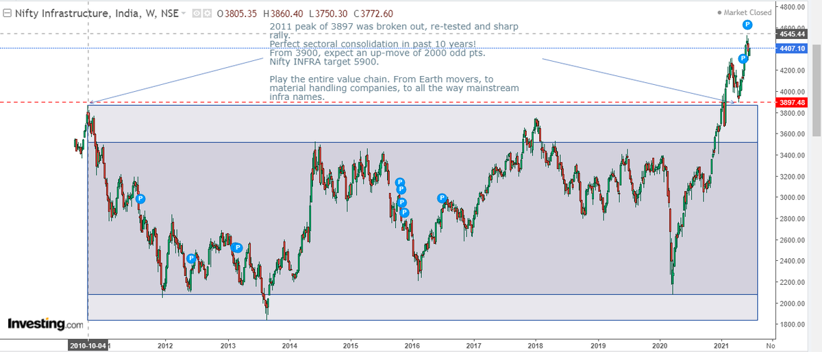 When a sector is awaken from its decade long slumber, entire value chain must be played. Have a look at Nifty Infra. Superb BO + Re-test & rally. Play entire value chain - from earth movers, to excavators, mat. handlers to the biggies like