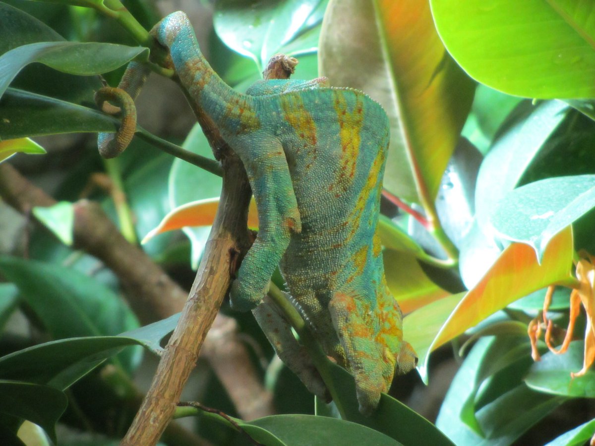 Rather fabulous panther chameleon picking up the colours of the rubber plant leaves