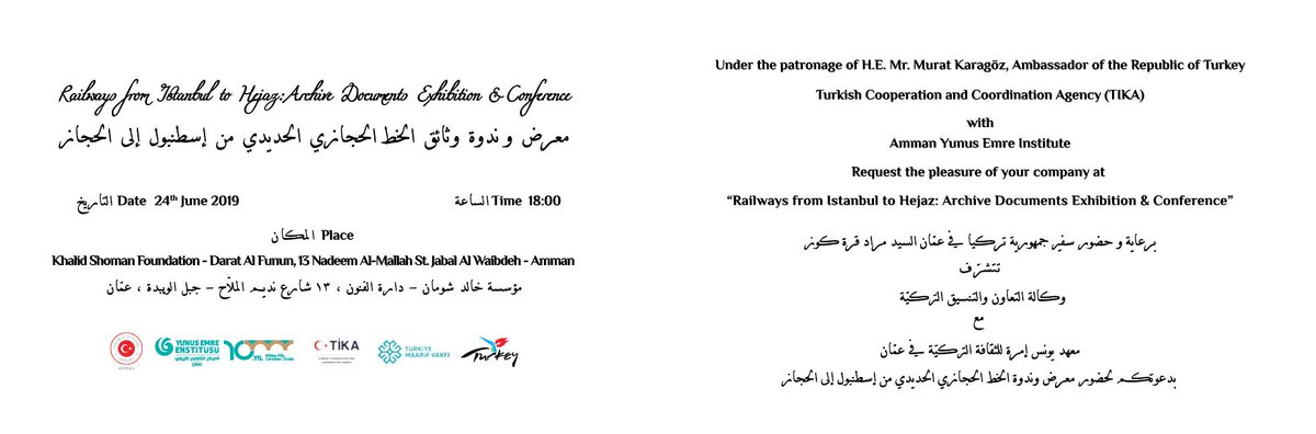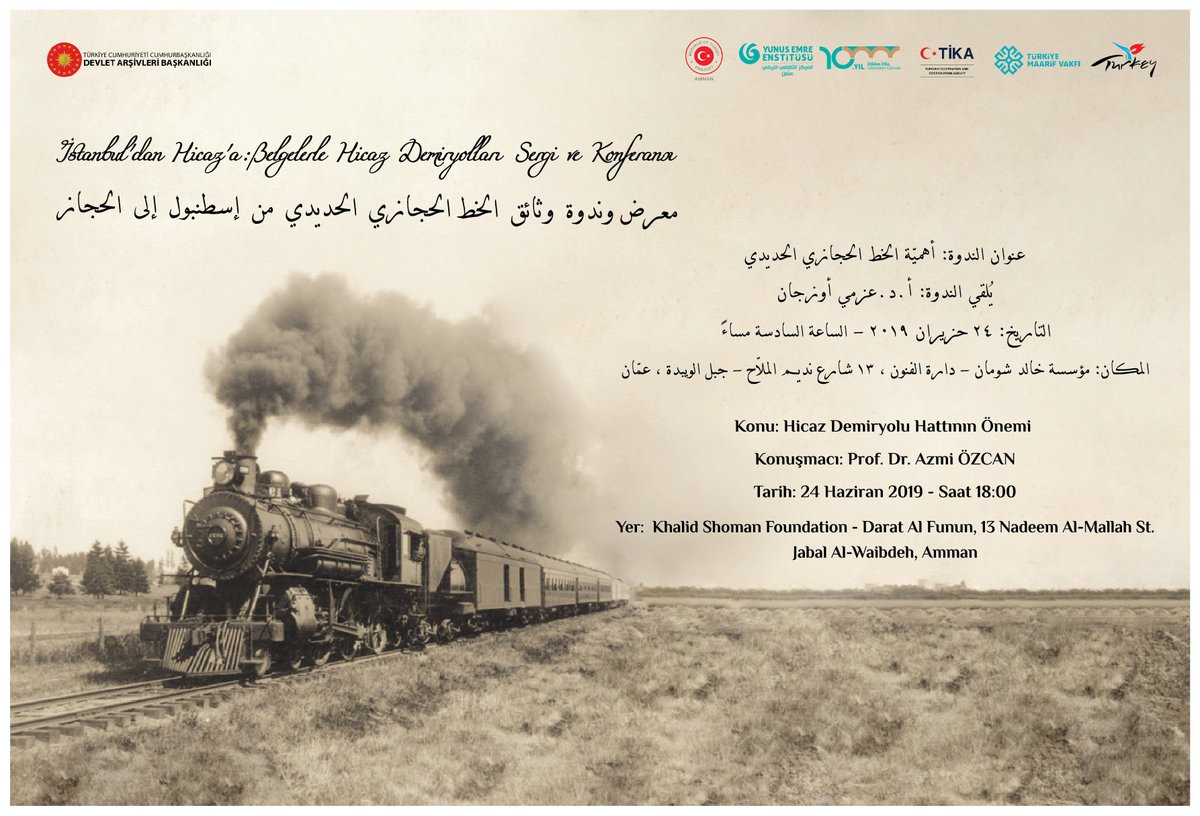 Invitation: Under the patronage of the Turkish Ambassador of Amman, H.E Mr. Murat Karagöz, in cooperation with Turkish Maarif Foundation, Turkish Cultural Center (Yunus Emre) and TİKA. Hijaz Railway Exhibition and Seminar will be held in Amman.