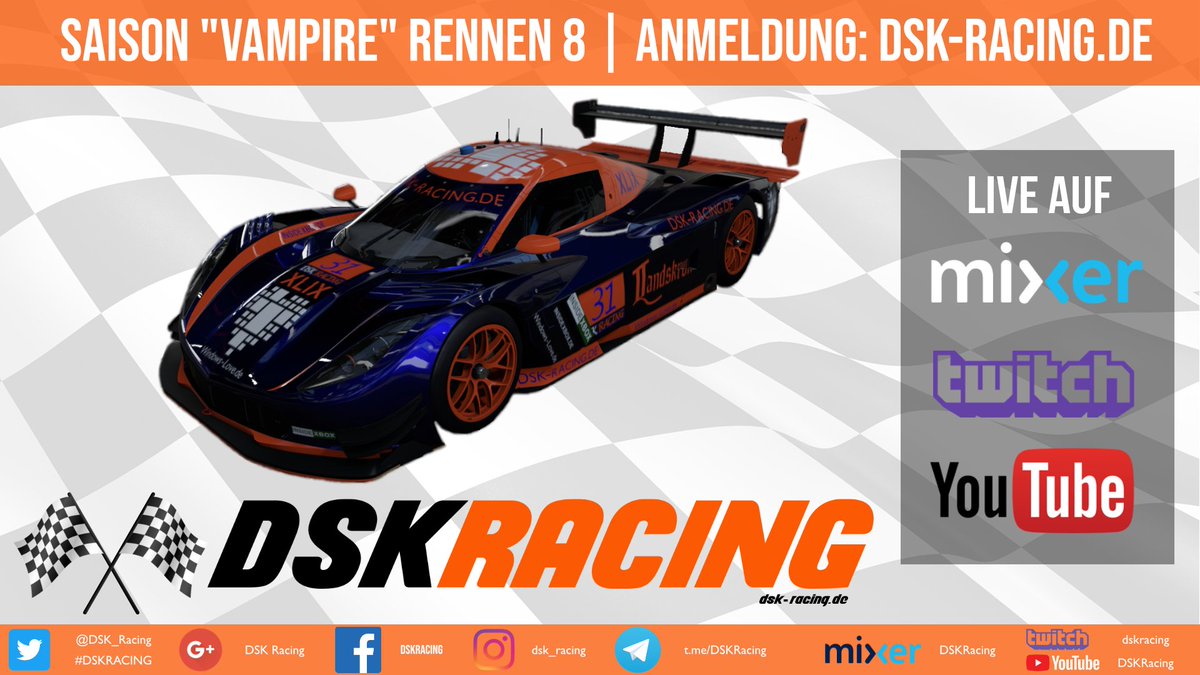 Am Freitag den 20. und Samstag den 21.7 findet unser Finales Rennen in der Saison Vampire statt. Der neue Meister darf sich nächste Saison eine Strecke plus Auto auswählen die gefahren wird. Wie immer sind wir Live.