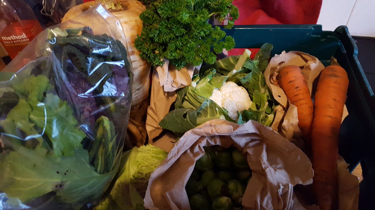 #SmallBeauties and some not so small ones. 2nd veg box has been as exciting as the 1st. Spuds, carrots, onions, eggs (same each week) plus biggest parsnip in the world, purple chard, mixed spicy leaves, parsley, cabbage, cauli, sprouts.#VegBox#ShopLocal#EatSeasonal#LoveFoodpic.twitter.com/YHaCk1rbHZ