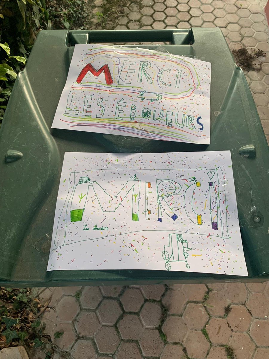 #COVID19 by posting kids' drawings on garbage cans. These are my boys' masterpieces. Small way to thank the real#heroes#eboueurs#confinementpic.twitter.com/uQWZMH4J2S
