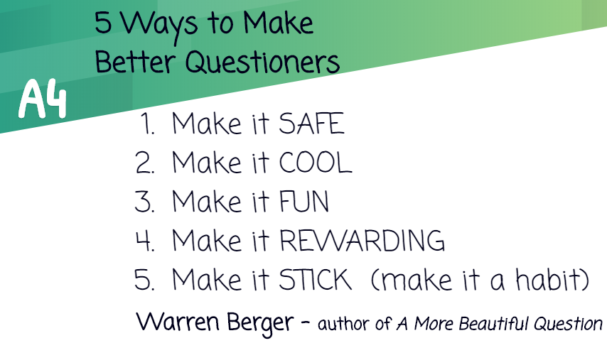 A4: My first answer is MODEL, MODEL, MODEL. Ask good quesitons in the classroom and Ss will pick it up from your great example. Warren Berger shared his 5 ways.