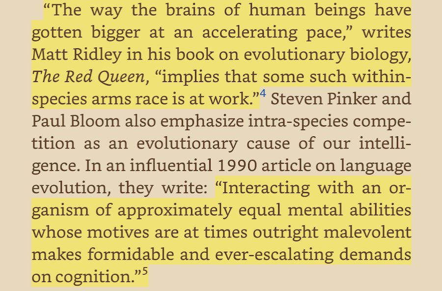 #ElephantInTheBrain by@KevinSimler,@robinhanson: Redwood trees evolved to be exceptionally tall due to competing with each other for light. Likewise, one of the reasons humans evolved exceptional intelligence was due to intraspecies competition.pic.twitter.com/l0nWeUew92