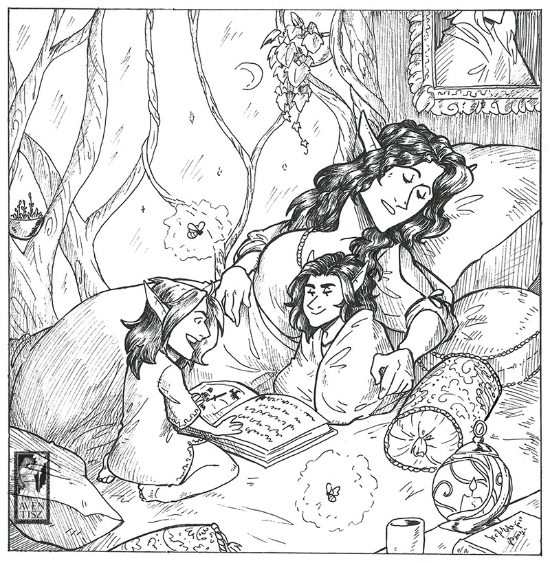 #elfebruary2020 day 2 -- Bedtime Story. Mithenia had a very happy childhood. Her parents were there for her, and she had two grown older siblings to watch out for her. This is mom, a stronk bear druid. pic.twitter.com/bcPaZWVQvP
