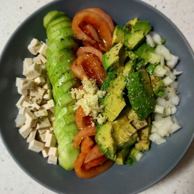 Tofu, pepino, tomate, aguacate, cebolla y ajo