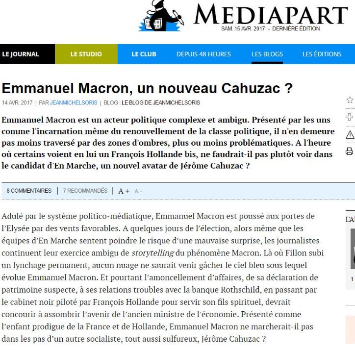 #Mediapart vient de révéler que#Macron est potentiellement un nouveau Jérôme#Cahuzac#EmmanuelCahuzac https://blogs.mediapart.fr/jeanmichelsoris/blog/140417/emmanuel-macron-un-nouveau-cahuzac … -