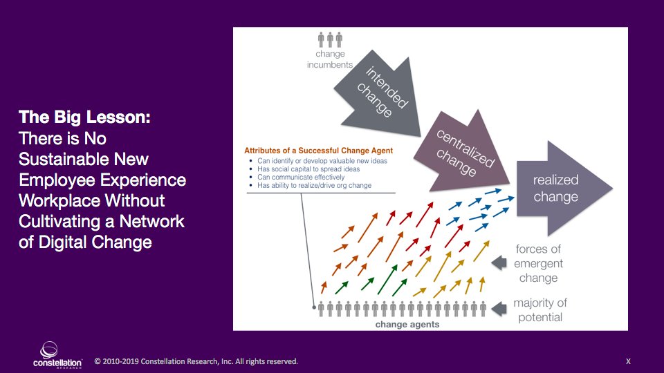#employeeexperience today: A key lesson is that there is no meaningful new#EX without cultivating a network of#changeagents to champion and distribute ideas, techniques, tools, and fresh skills/mindset.#digitalworkplace#cio#chro#hr pic.twitter.com/JyMx1d0pLm