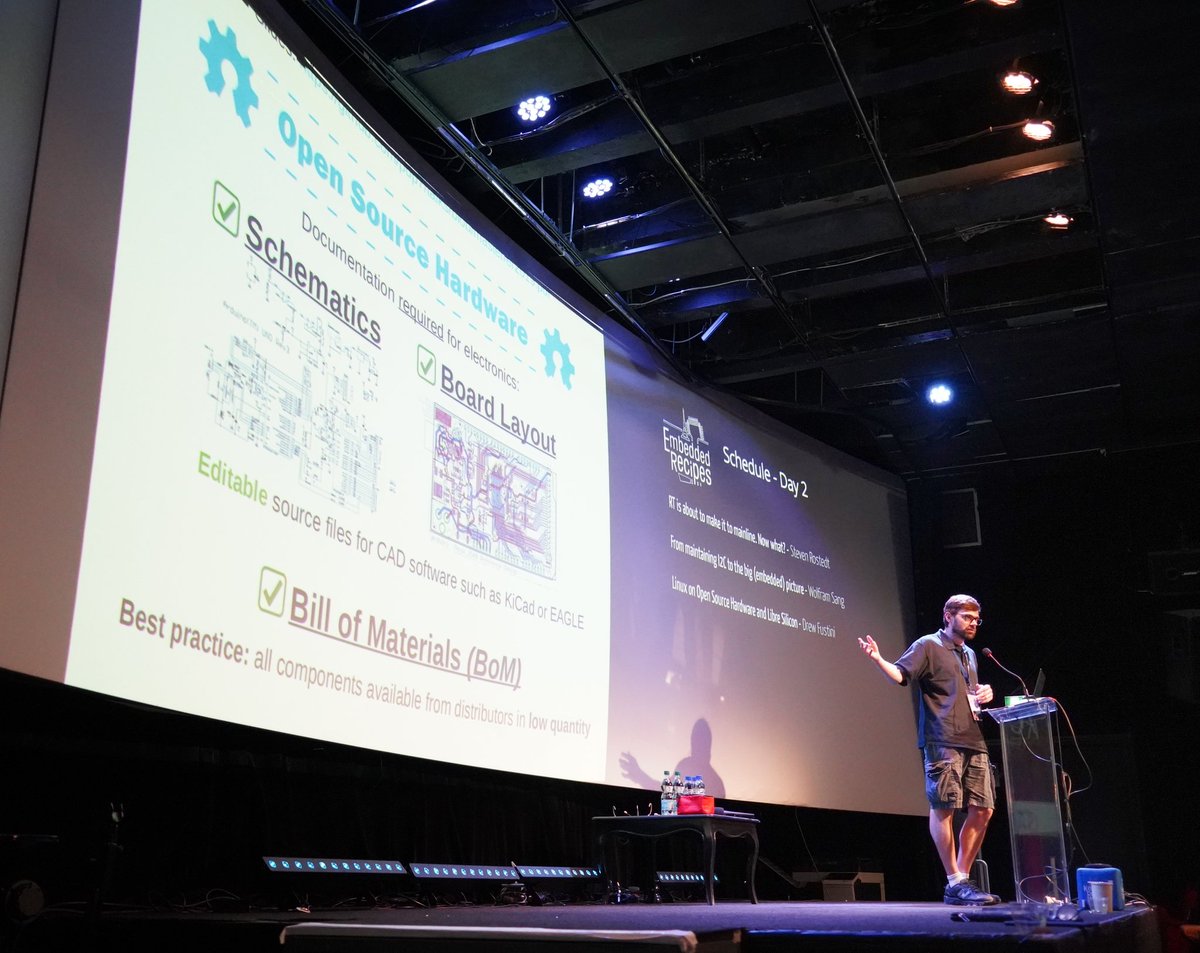 @pdp7 takes the stage@EmbeddedRecipes#er2019 to explain Open Source Hardware initiative@oshw@oshpark Purple PCBs ftw!!pic.twitter.com/bGnatpNuN8