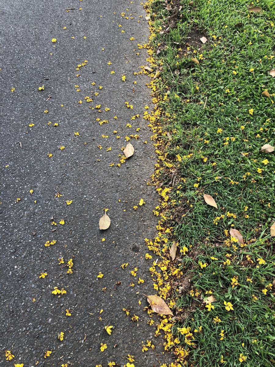 Following yellow petals surrendered by a leopard tree strewn by a Saturday evening breeze.