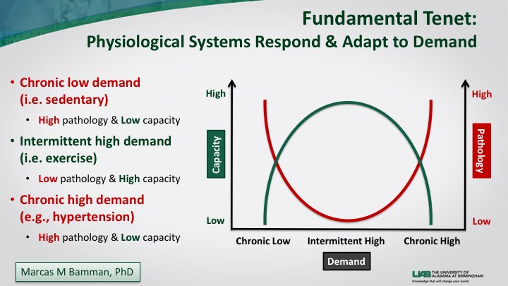 Our physiological systems respond & adapt to demand. This conceptual slide summarizes how the demands we place on each organ system result in positive or negative adaptations, and why the intermittent high demand of