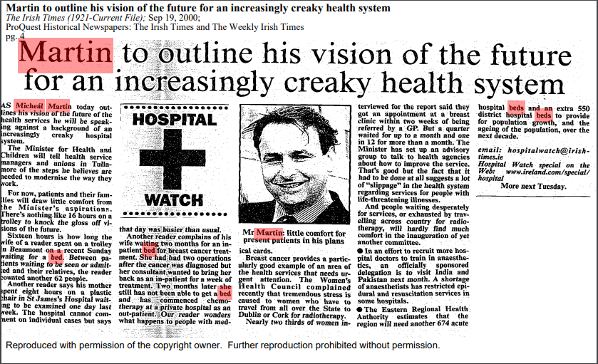 Has Micheal Martin forgotten about 16 hour trolley waiting times? This article is from 2000 via the Irish Times archive.