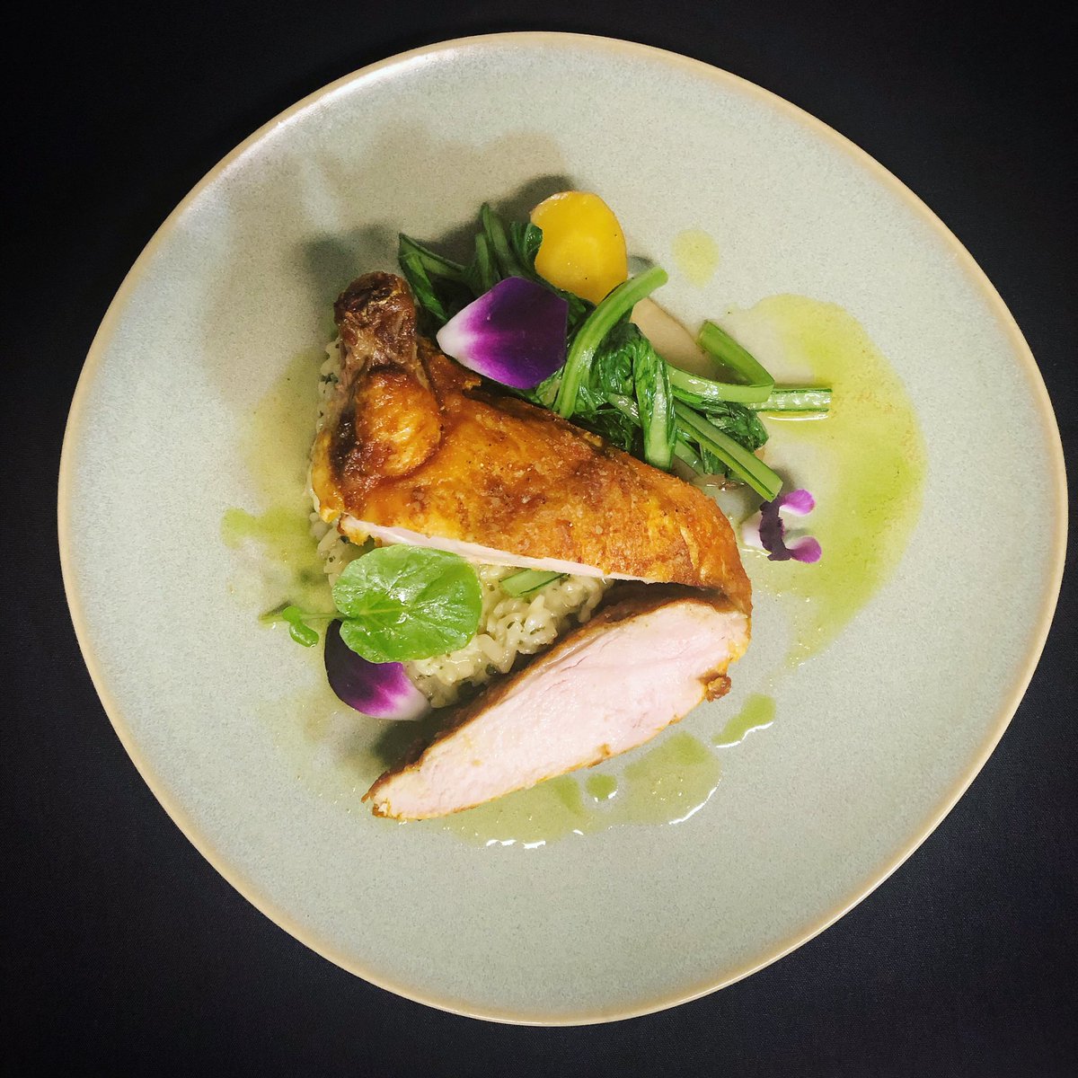 Chicken supreme, turmeric butter sauce, herbed risotto, sautéed greens & heirloom carrots