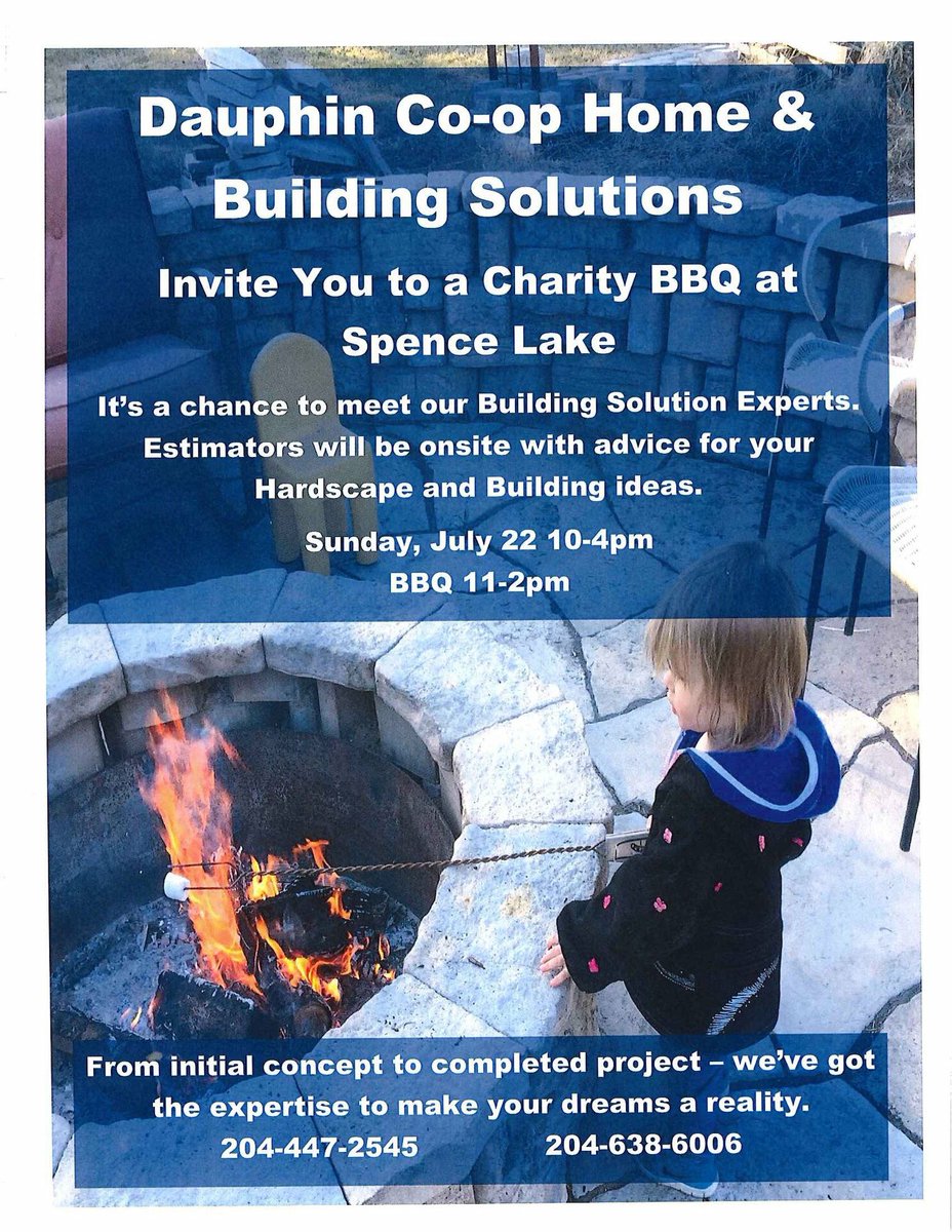 Sunday at the lake? Stop in at Spence Lake for a Charity BBQ hosted by Dauphin Co-op! Thinking of updating your lake property or backyard? We will have Estimators on site ready to advise you on the best options.