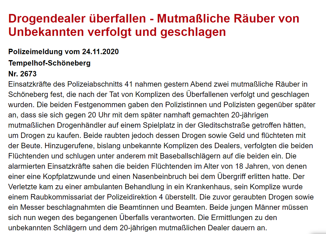 Hier kam keiner gut bei weg! Ein Drogendealer wurde von zwei Personen ausgeraubt, dessen Komplizen verfolgten die Räuber, schlugen sie mit Baseballschlägern und flüchteten. Räuber