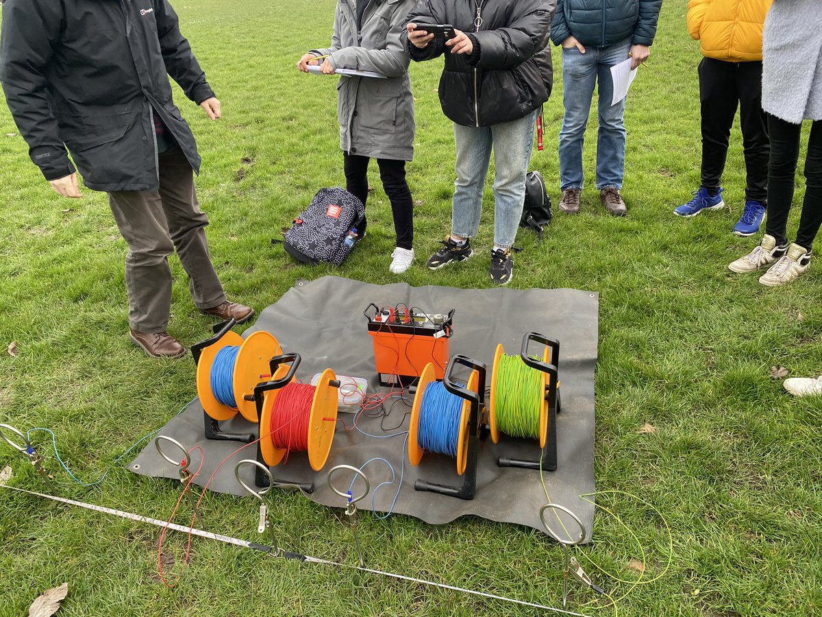 #7DaysOfFieldwork Recently I’ve been doing more geophysical surveys in the field. Here’s a set up for resistivity depth sounding in Victoria Park, Leicester we did as practice yesterday afternoon.#geology#fieldwork pic.twitter.com/80WMUHoWSg