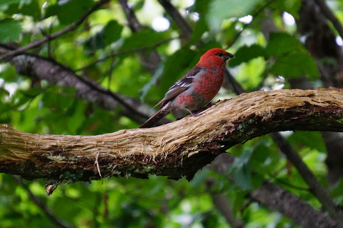 Can you find the bright red Pine Grosbeak hiding in these woods?
