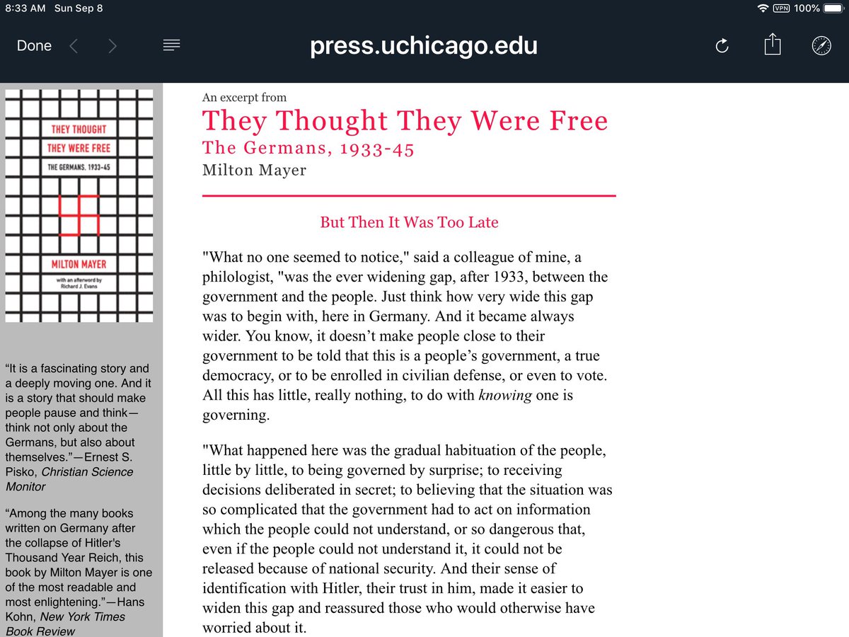End I Recommend This Book By Milton Mayer Who Interviewed 10 Nazis After WW2...It’s Scary The Similarities He Describes The Feelings, Emotions, Numbness Of Germans During 1933-1945 2 What Were Experiencing Now...Understand Now B/c It Could B Erased