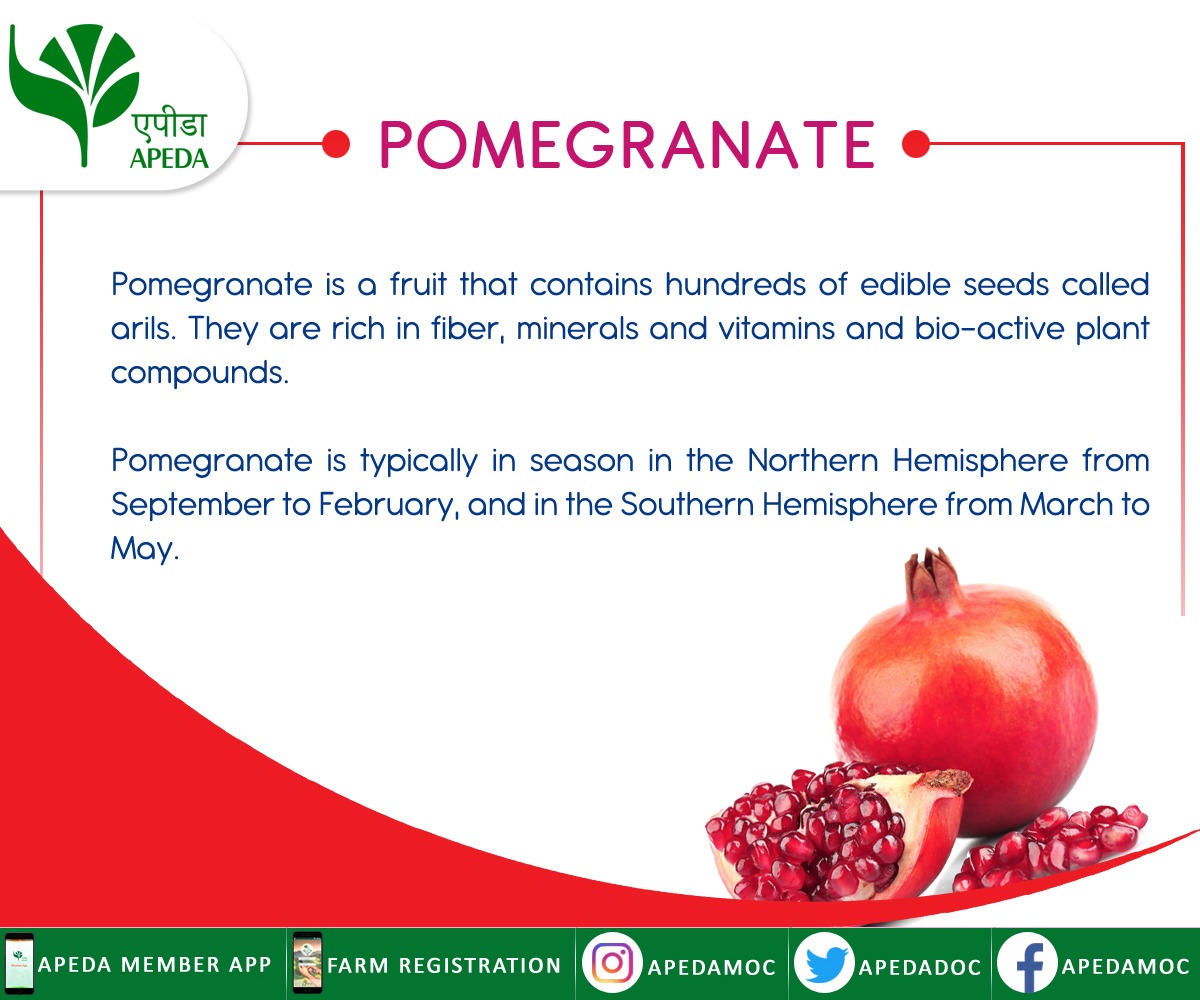 #Pomegranate is a#fruit that contains hundreds of edible seeds called arils. They are rich in fiber, minerals and#vitamins and bio-active plant compounds.#AatmaNirbharBharat#AmritMahotsav#Agriculture#Vocal4GI#APEDApic.twitter.com/2GWrneIk9l