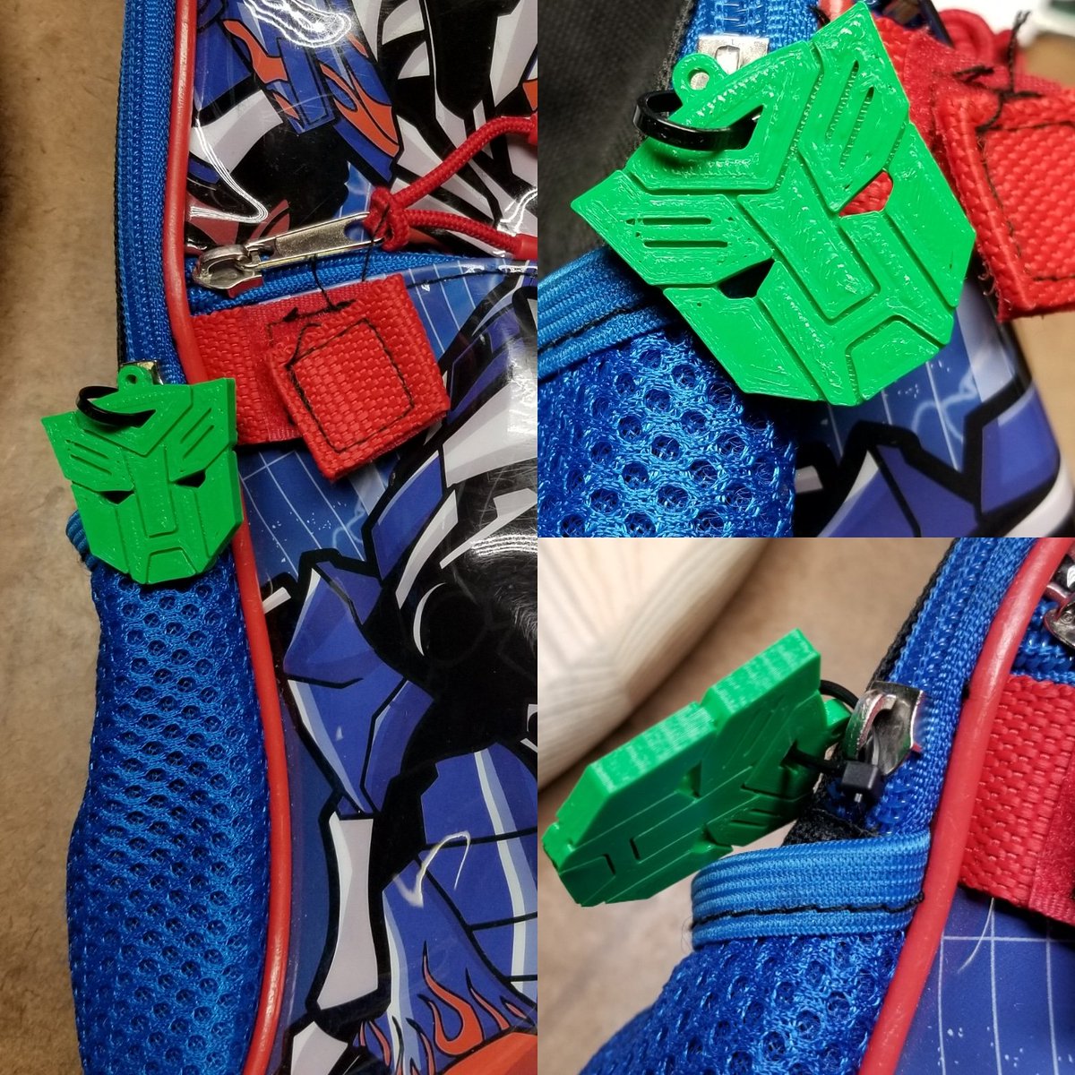 My four year old came to me with another project. His beloved transformers backpack he carries to preschool lost its zipper handle. So we