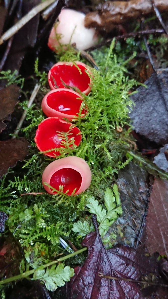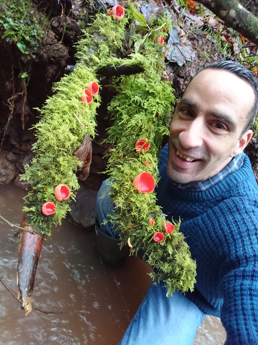 The perfect time of year - and weather - to find Scarlet Elf Cups nestled in the bright moss growing on decaying sticks. A burst of winter colour!