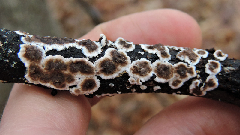 "A new family of fungi added this week! Giraffe Spots (fruiting bodies) parasitized by the distinctive Witches Butter fungus." Howard Co., Maryland (1/10/2020). Photo by Emilio Concari.