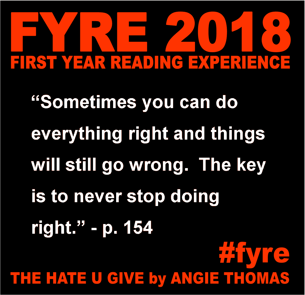 We are SO excited about this year's FYRE book, The Hate U Give, by Angie Thomas - first-year students will get a copy FREE at Orientation! "Sometimes you can do everything right and things will still go wrong. The key is to never stop doing right." - p. 154