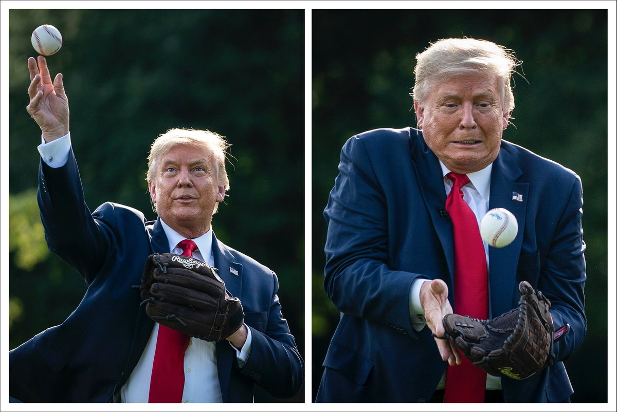 President Donald Trump plays catch with former Yankees Hall of Fame pitcher Mariano Rivera on the South Lawn of the White House to mark Major League Baseball’s Opening Day