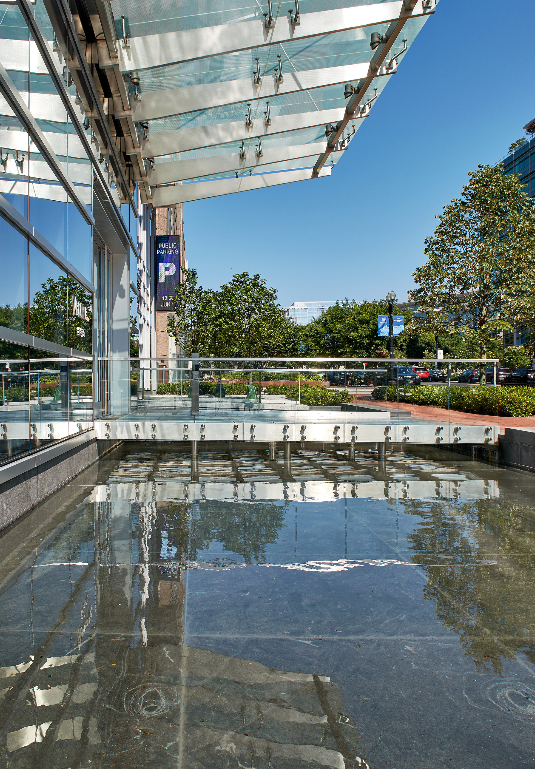 What a beautiful glass building entrance with a structural glass bridge over a small pond! Give us a call to learn about our GlassWalk™ structural glass product line
