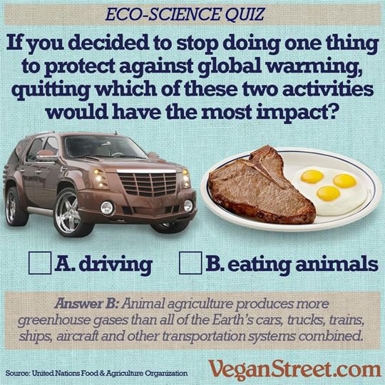 Eating animals has a far greater impact on global warming and climate change than driving a car. In fact animal agriculture produces more greenhouse gases than all transport systems combined!