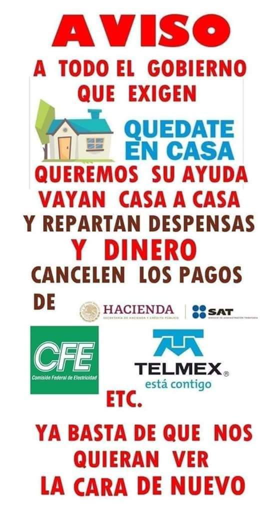 #subsistir, que ridículos, que en todos los medios con su estúpida frase "Quédate en casa", seguramente el#GobiernoDeMéxico pasa casa por casa repartiendo despensas, para que no salgan de casa. Ignorantes... pic.twitter.com/DmTGsrWE4l -