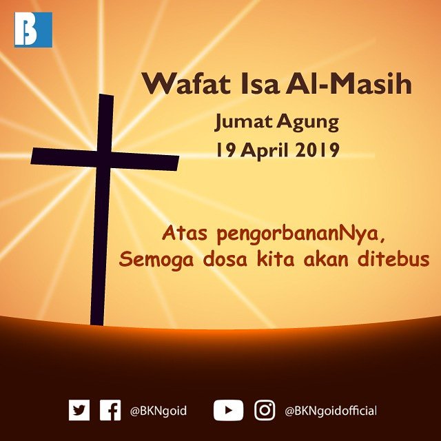 #SobatBKN yang memperingati Wafat Isa AlMasih, semoga segala dosa ditebus melalui pengorbananNya dalam Jumat Agung ini.#GoodFriday#GoodFriday2019pic.twitter.com/6qgMmUThhF