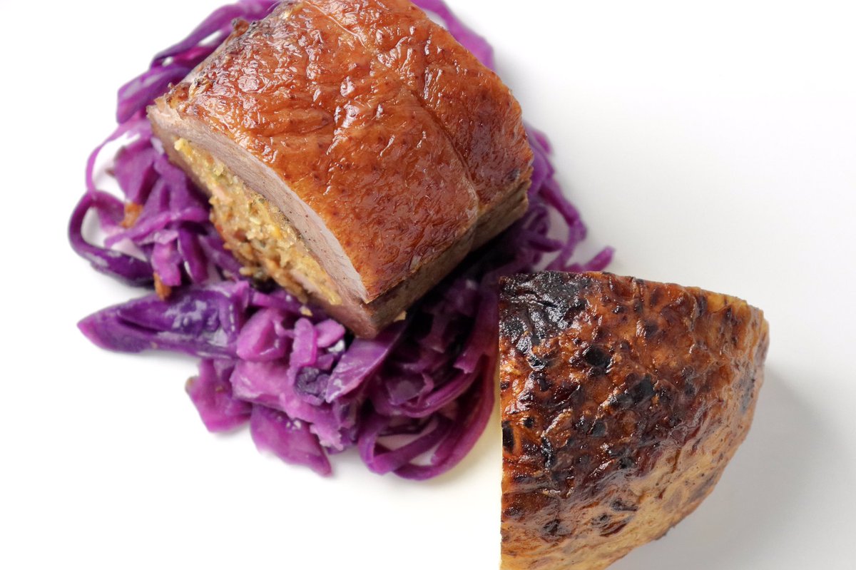 Ballotine of goose filled with apricots, parsley, croutons and leg meat. Warm red cabbage salad. Butter-roasted celeriac. .