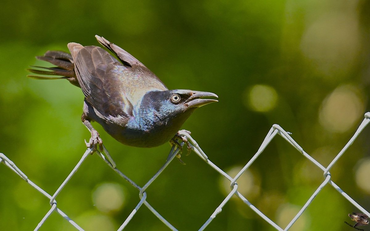 A Grackle coming in to land on the feeder in the bright sunlight.