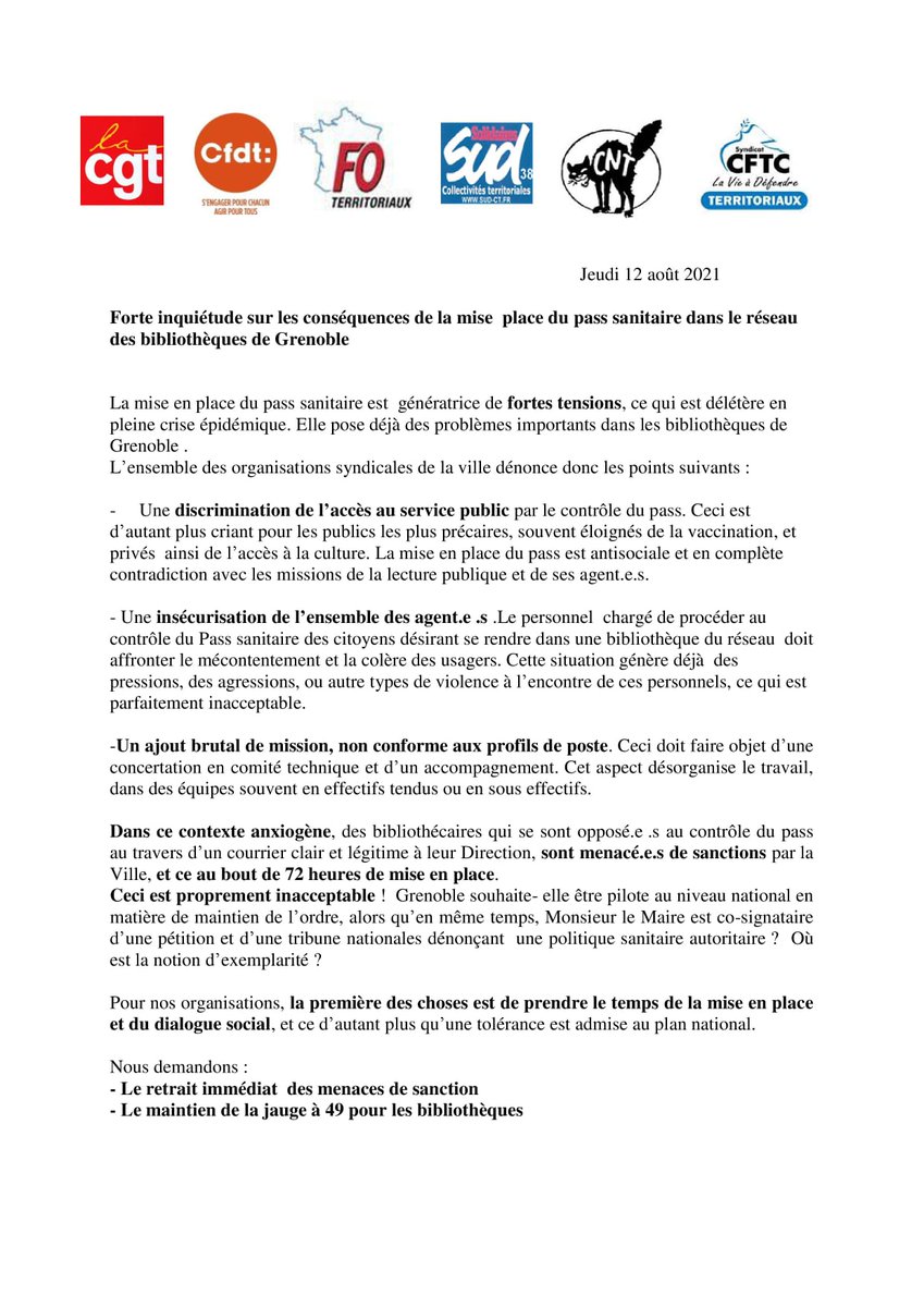 #grève pour les#bibliothécaires de#Grenoble contre le contrôle du#passsanitairepic.twitter.com/Kq3miT1Bi3