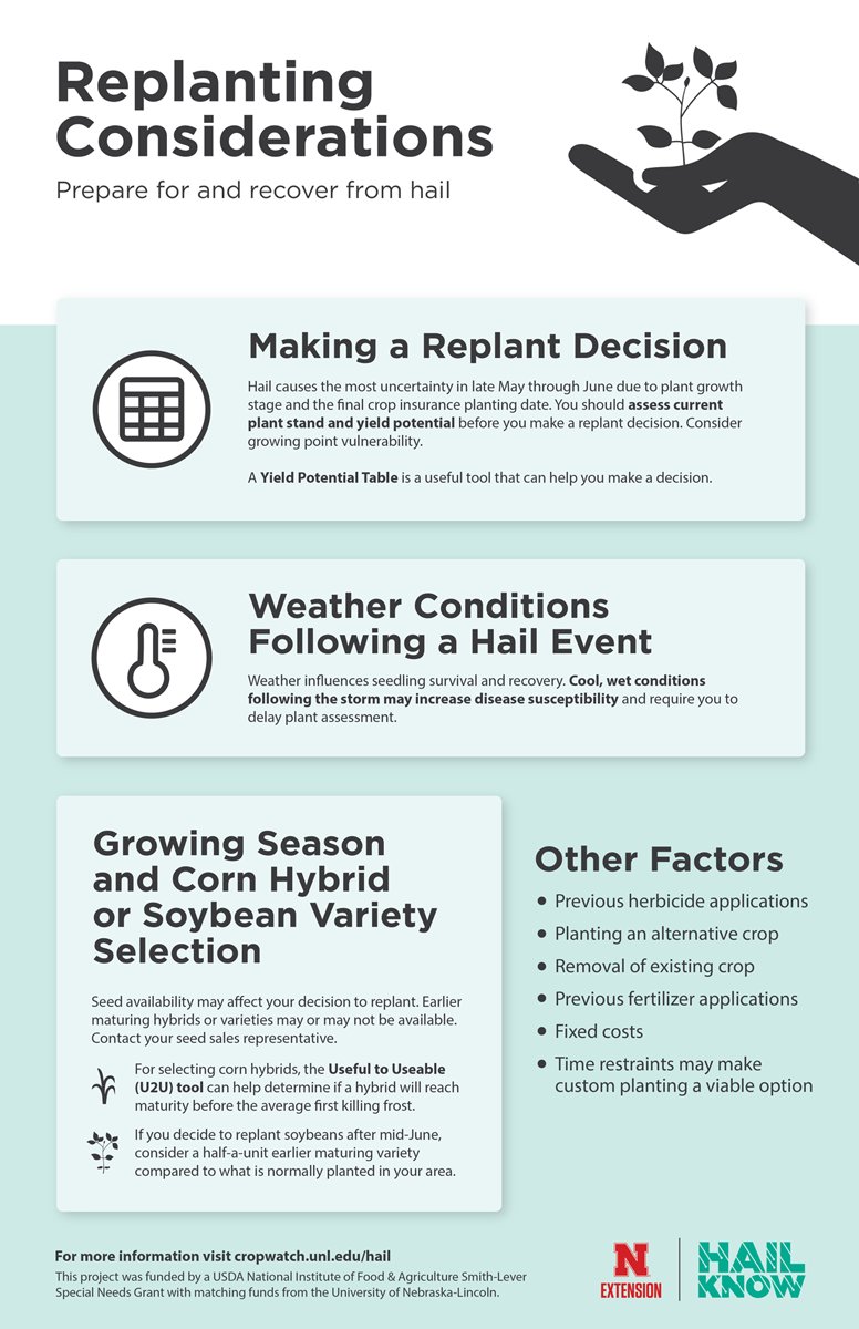 #Hail causes the most uncertainty in late May to June due to plant growth stage and the final crop insurance planting date. During this time, many farmers find themselves asking the#replant question. This infographic highlights factors to consider when deciding to replant or notpic.twitter.com/ylaTGUGqIH