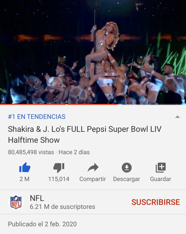 #SuperBowl, el#HalfTimeShow de#JLo y#Shakira va ya en 80 millones de vistas y se ubica en el puesto Nro 1 como el más visto en la plataforma de#YouTube Además se sigue manteniendo Nro 1 en tendencia mundial@SuperBowl@JLo@shakirapic.twitter.com/rmxchkTzCc