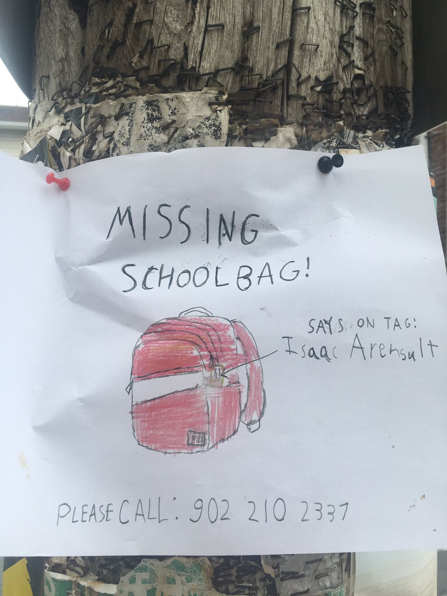 #halifax let’s help this kid find their backpack!! Sign spotted on the corner of Maynard and Cunard streets. pic.twitter.com/bmdeh3Ggzs – bei Halifax Armouries