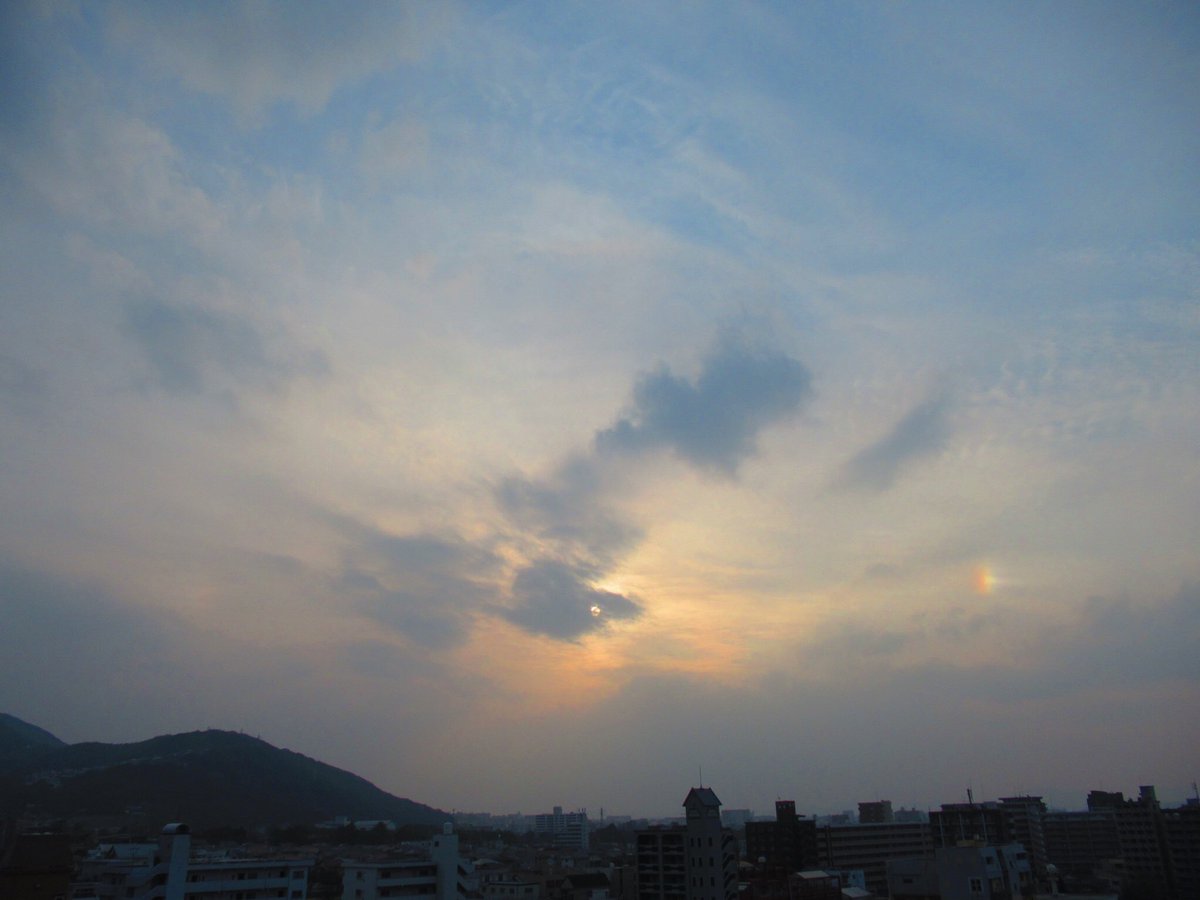 15:00ころ、四国 (松山あたり?) 上空で濃い雲のところだけ一瞬とても明るい左の映幻日が見えたけど撮影間に合わず。辛うじて撮れたのは薄めの映幻日。