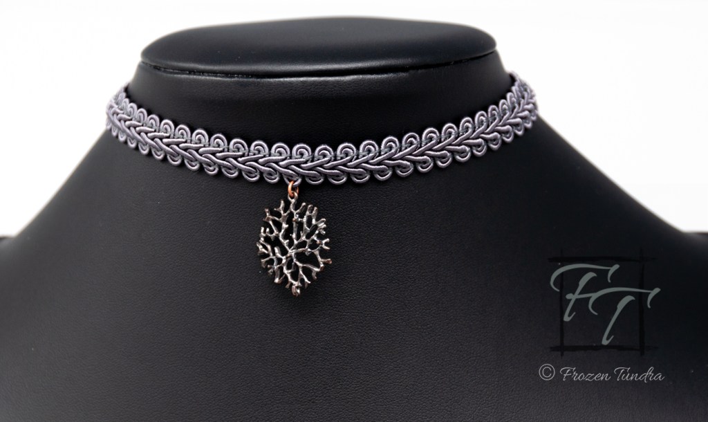 Druidess: A captivating choker featuring a delicate branch motif in antiqued copper on gray ribbon. The stark, winter-like design is ultra lightweight and minimal.