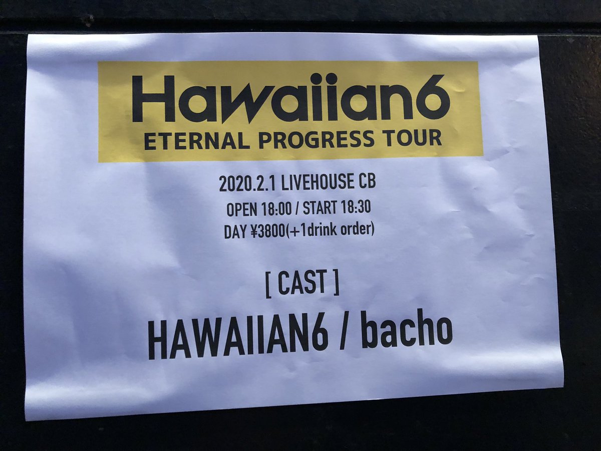 2/1 Hawaiian6 福岡CB bacho セトリ 1,僕はかげろう 2,萌芽 3,大いなる助走 4,さよなら 5,No memories 6,新曲 7,ビコーズ 8,決意の歌 9,最高新記憶