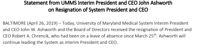 #BREAKING The president of the UMMS Board, Robert Chrencik has resigned. He has been on a leave of absence since 3/25 as the#HealthyHolly book controversy broke.@WMAR2Newspic.twitter.com/n6bKFC1oat