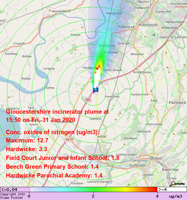 Latest Gloucestershire incinerator plume plot, 15:50 31/01/20
