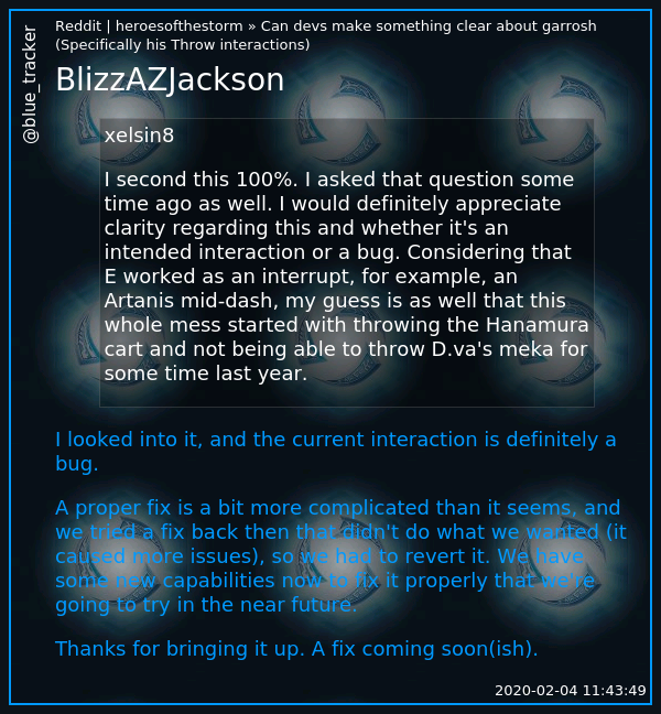 New post by BlizzAZJackson in Can devs make something clear about garrosh (Specifically his Throw interactions) in the Reddit | heroesofthestorm forum https://www.reddit.com/r/heroesofthestorm/comments/ey64lk/can_devs_make_something_clear_about_garrosh/fgjdm33/ … #bluetrackerpic.twitter.com/Tl5O66UBPM