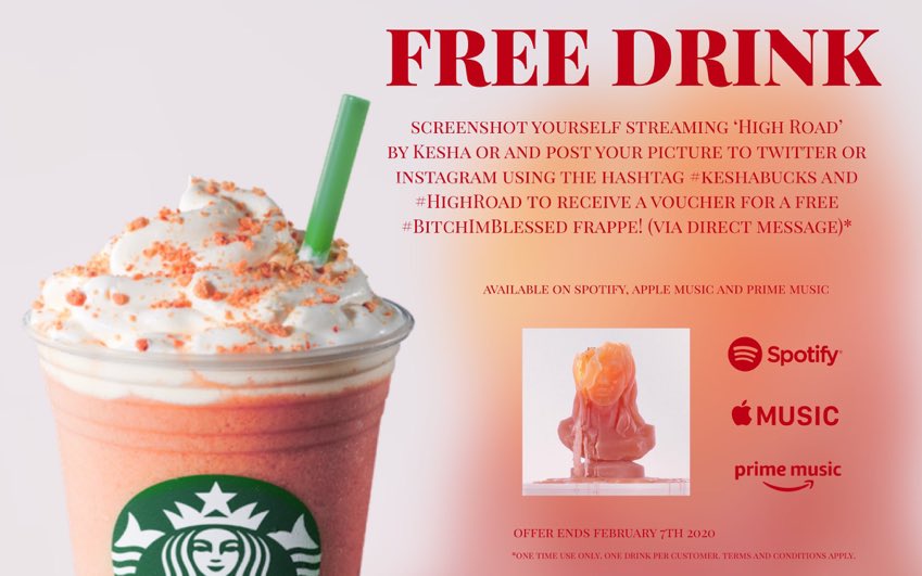 Starbucks is celebrating the release of Kesha’s 4th studio album with a promotion for a free drink of choice! Simply post a screenshot of yourself streaming