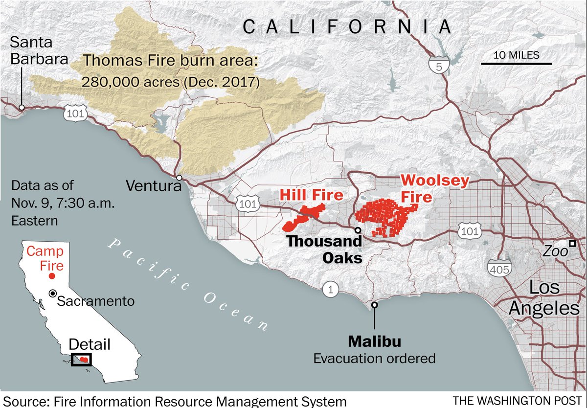 #CampFire - 113,000 acres burned, 25% contained. Over 6400 homes destroyed. 29 lives lost.#WoolseyFire - Over 90,000 acres burned. 20% contained. 370 structures destroyed. 2 lives lost.#HillFire - 4500 acres burned & 80% contained. https://nyti.ms/2B1yPic -