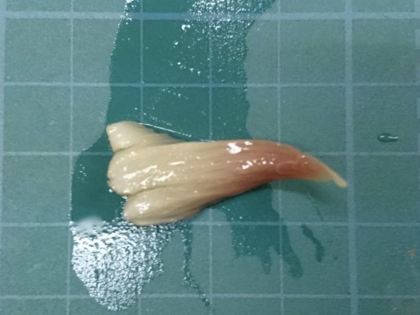 カバのあかちゃんはお腹の中にいる時は爪にカバーがついています。 生まれてまもなく自然に取れるので、プールの中に落ちてしまいましたが、掃除の際にいくつかは見つけることができました。 下のマットは1マス1センチです。